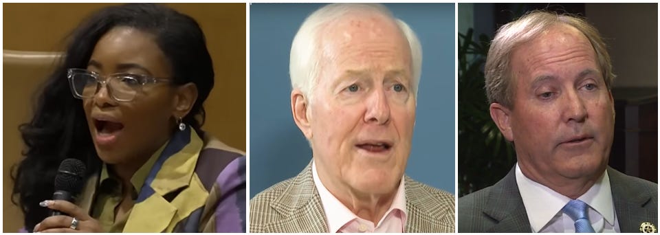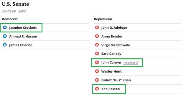 Line up for the Texas U.S. Senate Seat, Democrat darling Jasmine Crockett will likely face either incumbent Rpublican Senator John Cornyn or Attorney General Ken Paxton