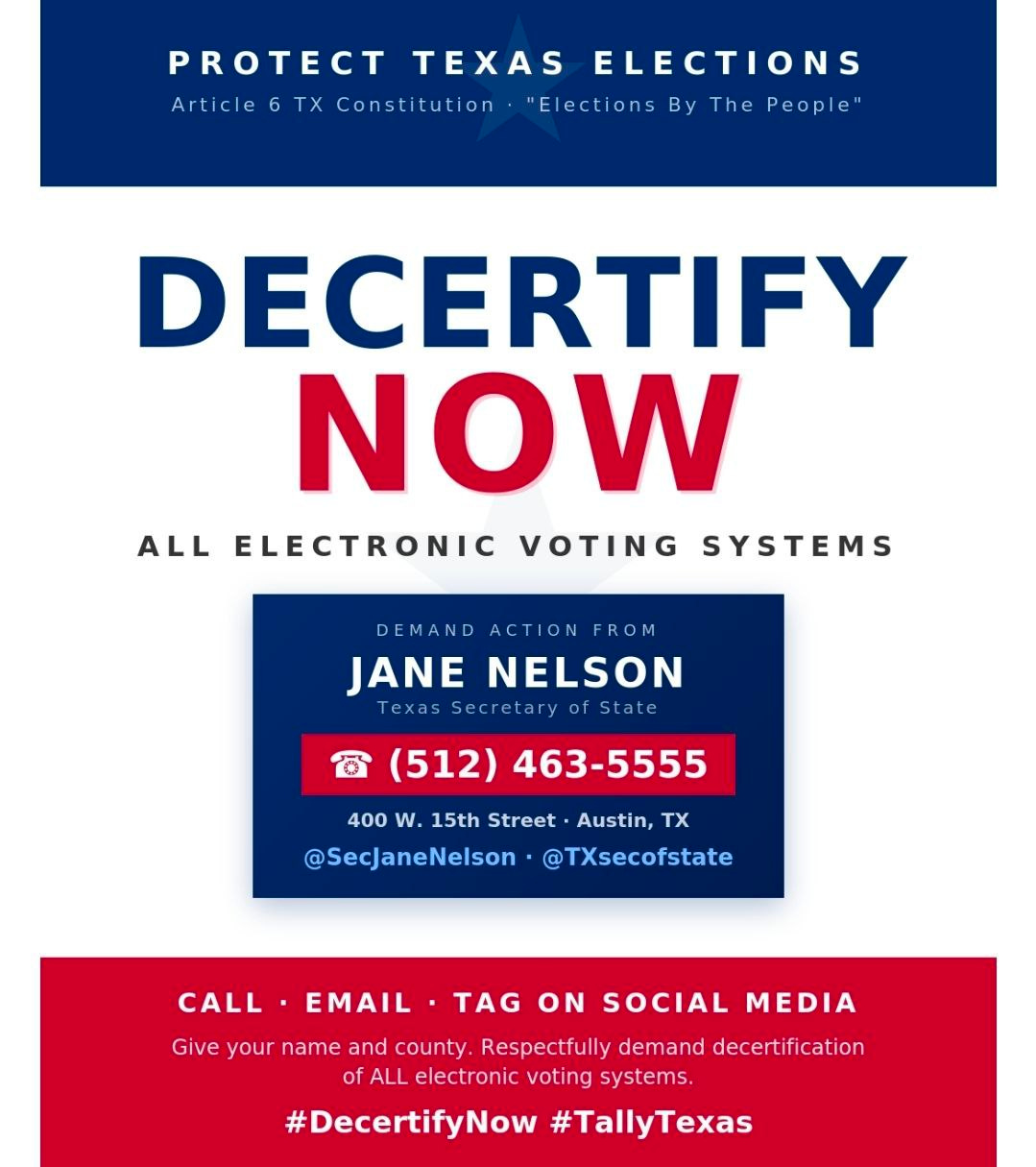 In this case, the mandated logic and accuracy test has demonstrated that the voting system is generating fraudulent votes and manipulating the auditable record in violation of the Texas State Constitution and statutes. It must be immediately decertified by state officials.